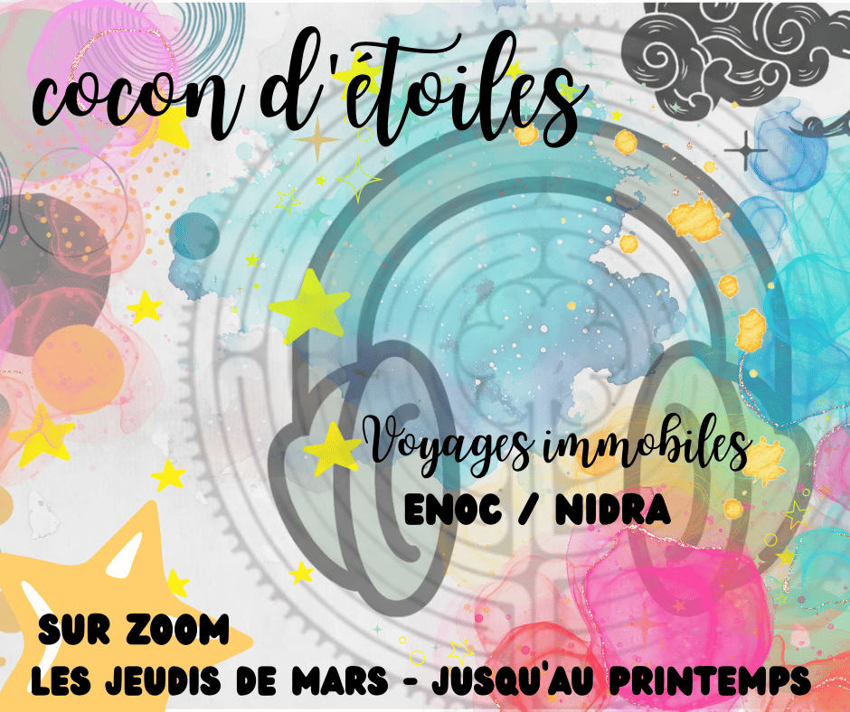 Comment ça marche? Vous vous connectez avec votre casque / ou sans, dans un endroit confortable, avec un plaid, on ferme les yeux, on coupe les caméras, on détache nos ceintures et on s’envole pour un rêve éveillé! *** Si vous en avez envie ou l’habitude, prenez papier crayon feutres stylos, particulierement ceux qui ont déjà participé aux ENOC, venez refaire les voyages!! *** Je vous guide, sur un fond de son bineural qui va faciliter l’expansion de conscience, particulièrement au casque. Au programme: Jeudi 5 mars : Voyage à travers les couleurs Jeudi 12 mars : Entrer en contact avec les Règnes (Mineral / Végétal / Animal / Subtil) Jeudi 19 mars : Voyage dans l’espace – expansion géographique Si vous en avez envie et que vous avez le temps, après l’expansion, à 20h, on se retrouve en fin de voyage, face caméra pour débrieffer 30 min, partager des mots ou des silences…. Ça vous tente? C’est un cocon d’étoiles… Un projet pour savourer vos soirées d’hiver et explorer votre imaginaire et vos mondes intérieurs…. 19 euros la soiréePetits budjets /// Me contacter en MP Réservez votre/vos cessions sur billetweb via le lien ci dessous billetweb.fr/la-boutique-des-etoiles |